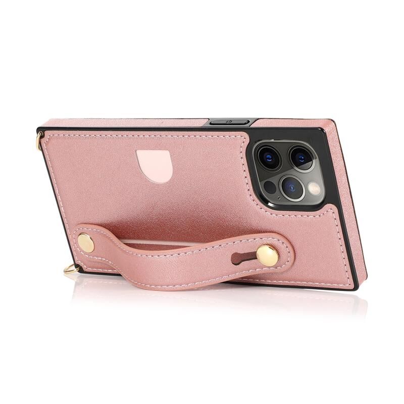 Θήκη προστασίας για iPhone 12 / 12 Pro από PU+TPU, ανθεκτική σε κρούσεις, με λουρί ώμου, βάση στήριξης, θήκη για κάρτες και λουρί καρπού (Χρυσό Ρόδι)