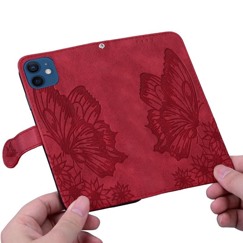 Θήκη δέρματος οριζόντιας αναδίπλωσης για iPhone 12 / 12 Pro με ανάγλυφα σχέδια πεταλούδων σε ρετρό υφή, με βάση & υποδοχές καρτών & πορτοφόλι (Κόκκινο)