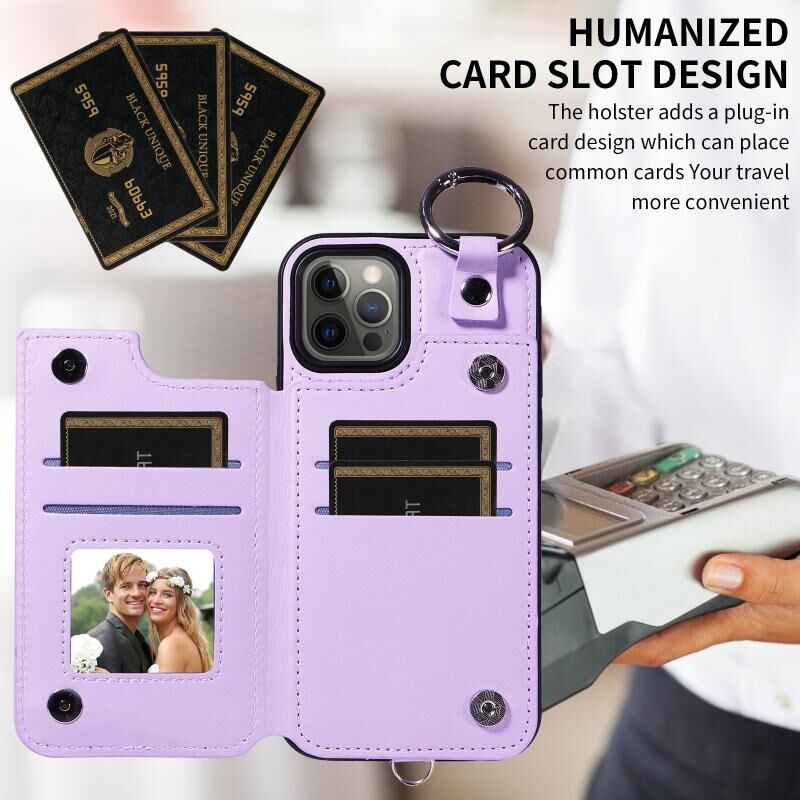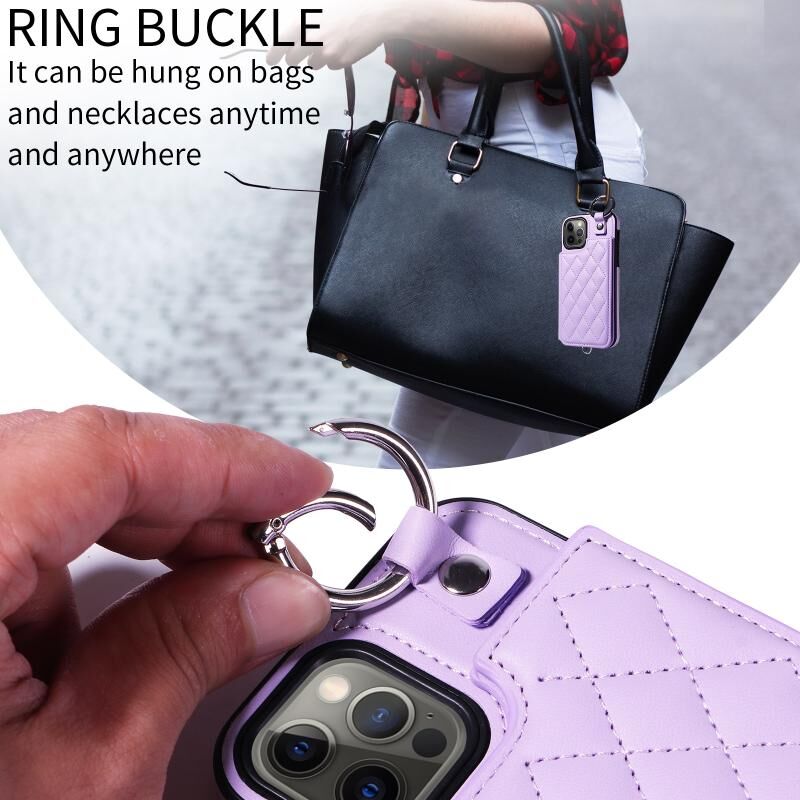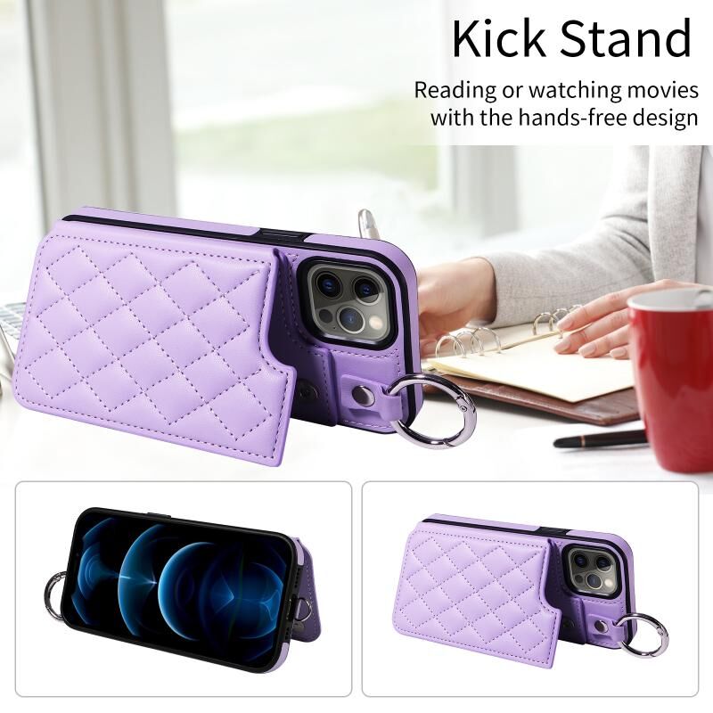 For iPhone 12 / 12 Pro Rhombic Texture Card Bag Phone Case with Short Lanyard(Purple)
