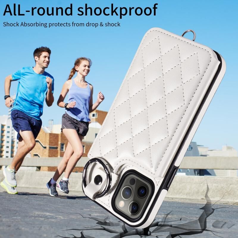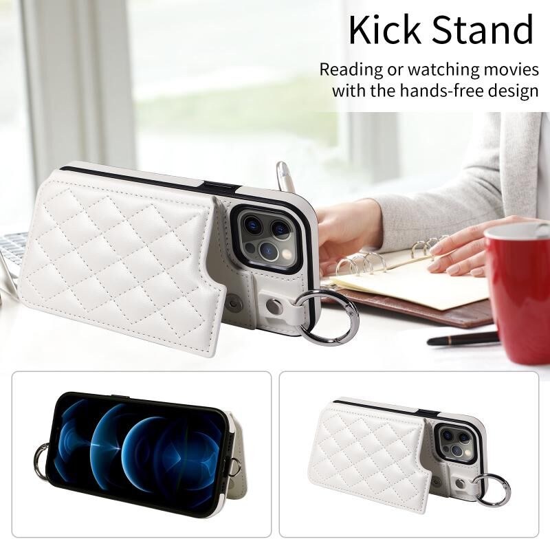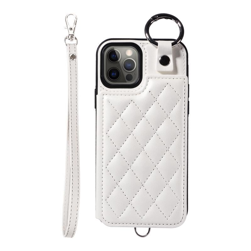 For iPhone 12 / 12 Pro Rhombic Texture Card Bag Phone Case with Short Lanyard(White)