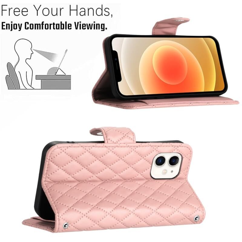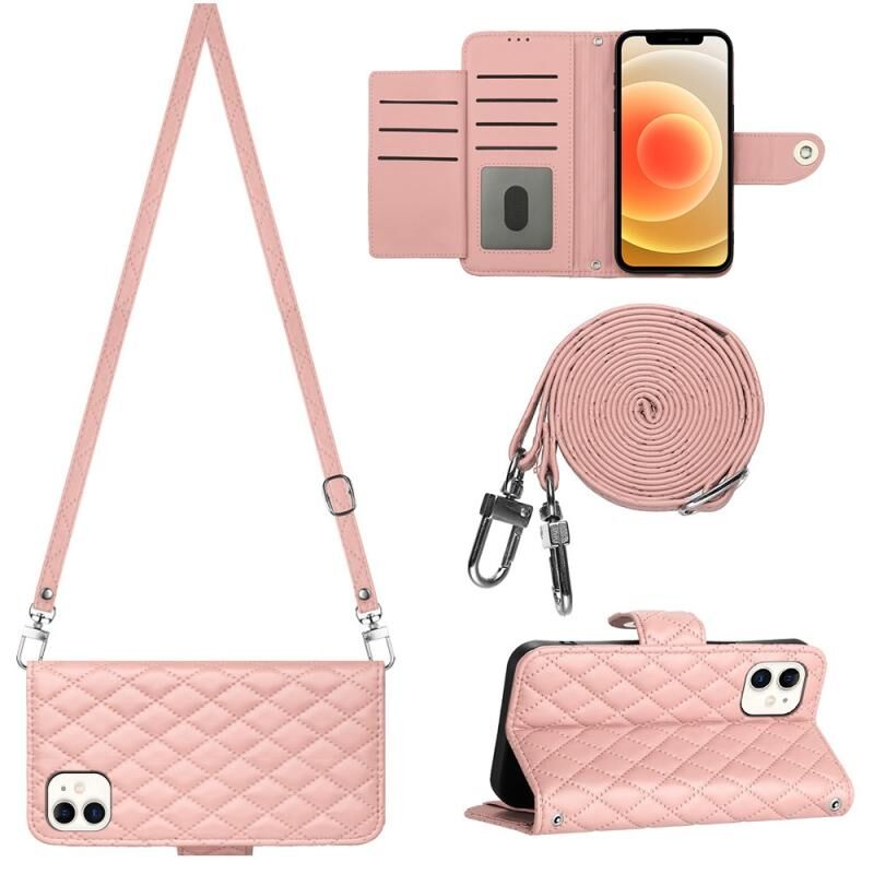 For iPhone 12 / 12 Pro Rhombic Texture Flip Leather Phone Case with Long Lanyard(Coral Pink)