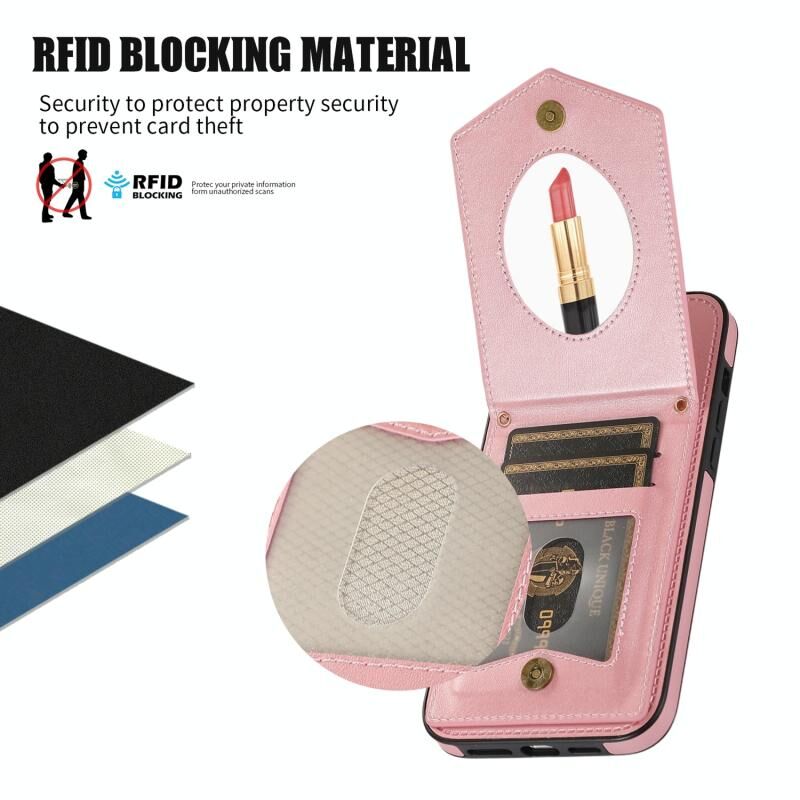 For iPhone 12 / 12 Pro Rhombic Texture RFID Phone Case with Lanyard & Mirror(Rose Gold)