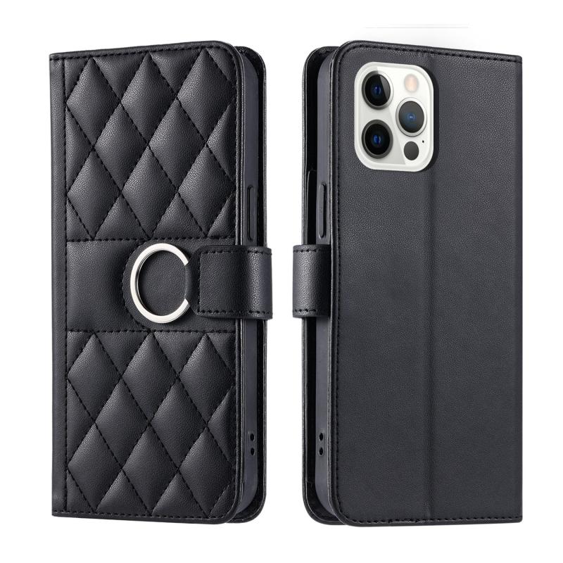 For iPhone 12 / 12 Pro Ring Buckle Rhombic Leather Phone Case(Black)