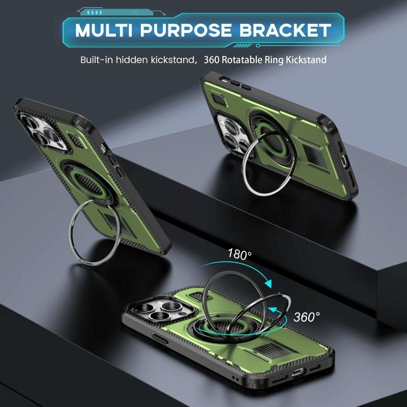 3. Δακτύλιος Σιλικόνης και Βάση: Δεν παρέχει μόνο βασική προστασία, αλλά η θήκη λειτουργεί και ως λαβή για να κρατάτε σταθερά το τηλέφωνό σας. Και ως βάση τηλεφώνου που επιτρέπει την κατακόρυφη ή οριζόντια λειτουργία σε πολλαπλές γωνίες.