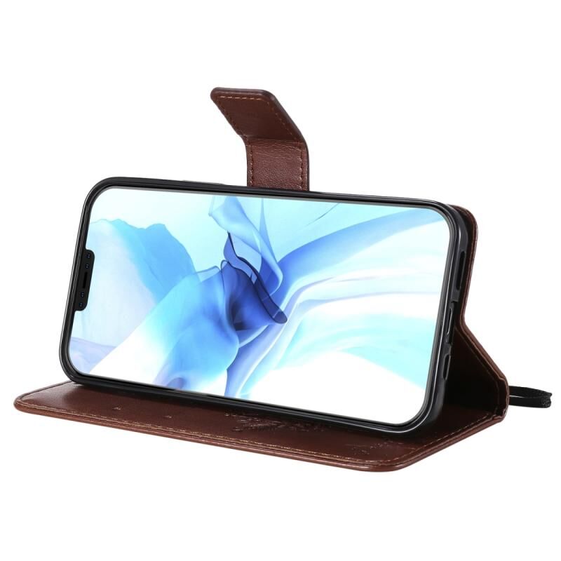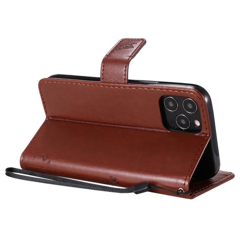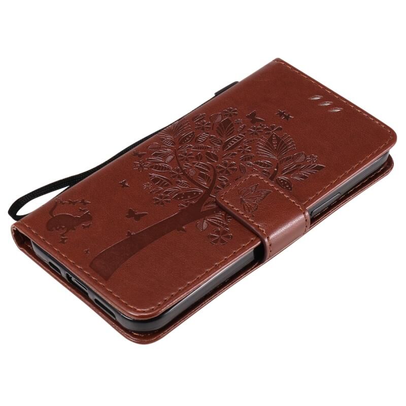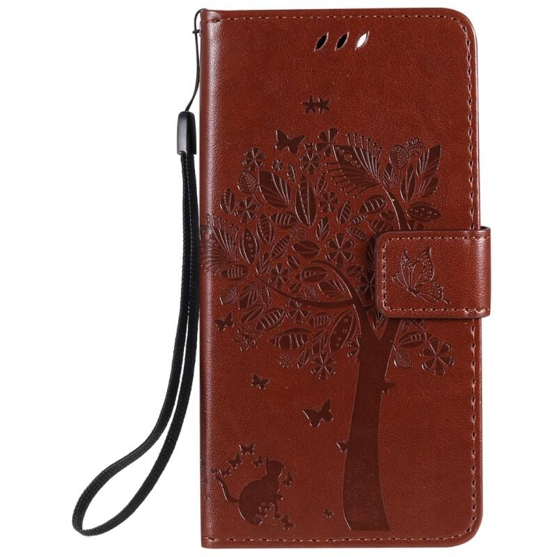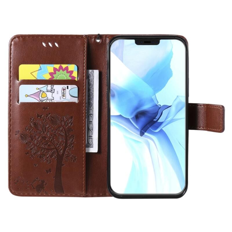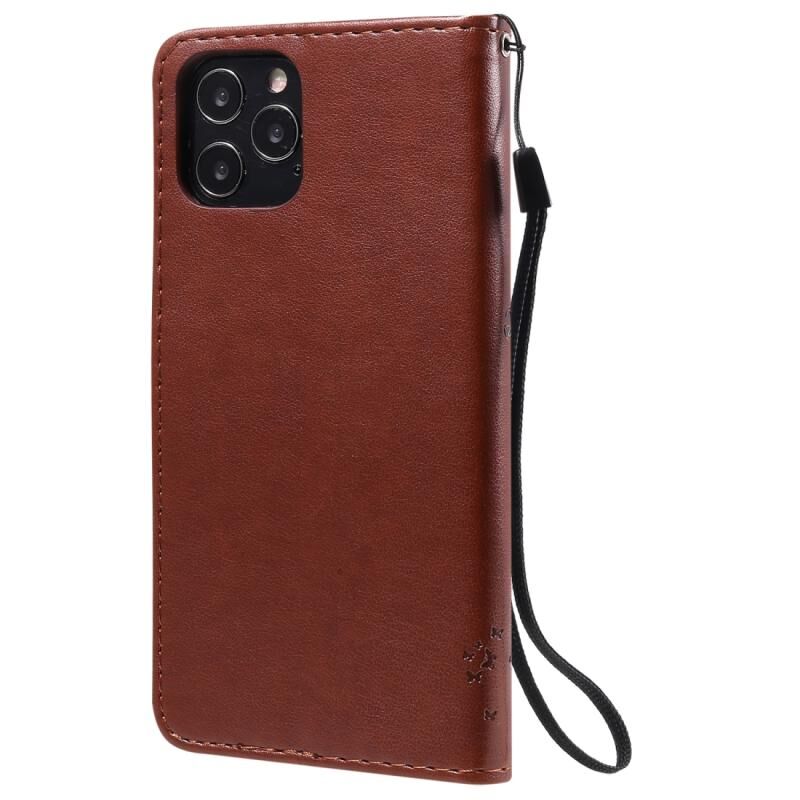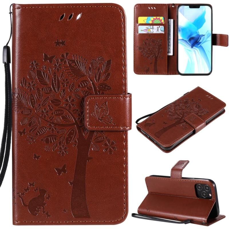 Θήκη δέρματος οριζόντιας αναδίπλωσης για iPhone 12 / 12 Pro με ανάγλυφο σχέδιο δέντρου & γάτας, με βάση στήριξης & θήκες καρτών & πορτοφόλι & κορδόνι (Καφέ)