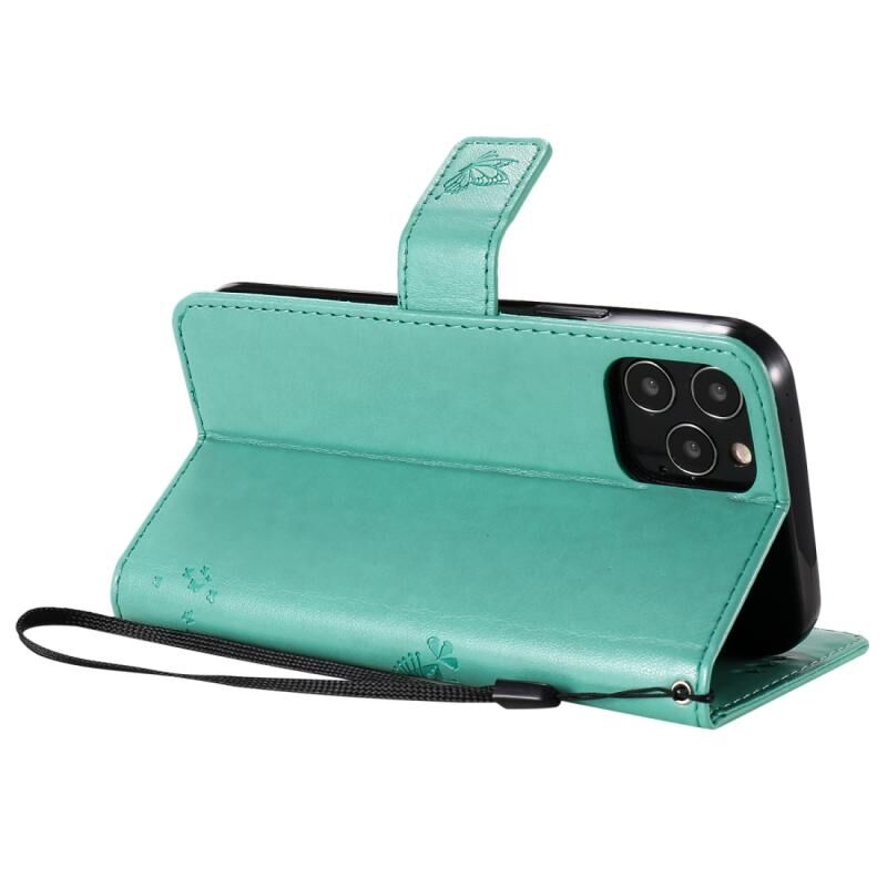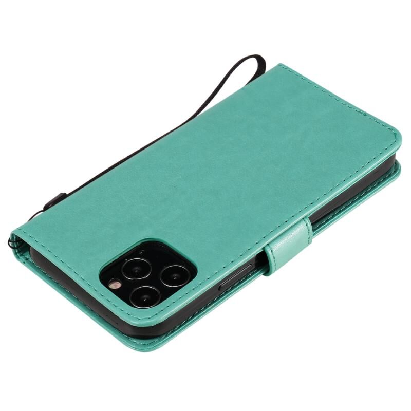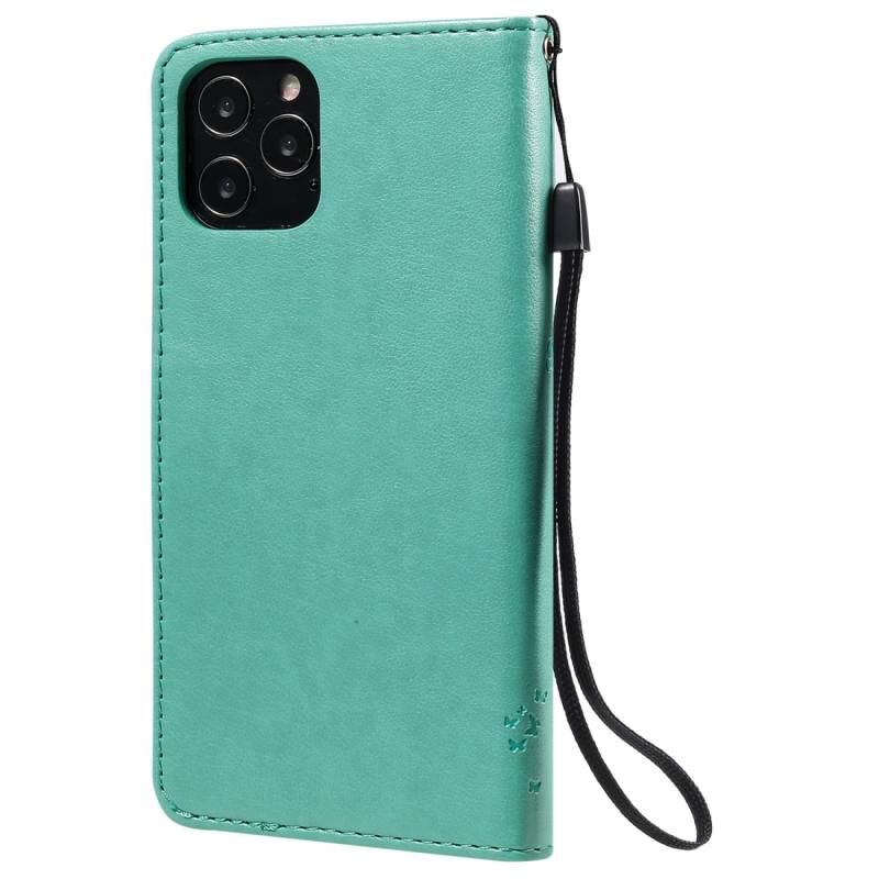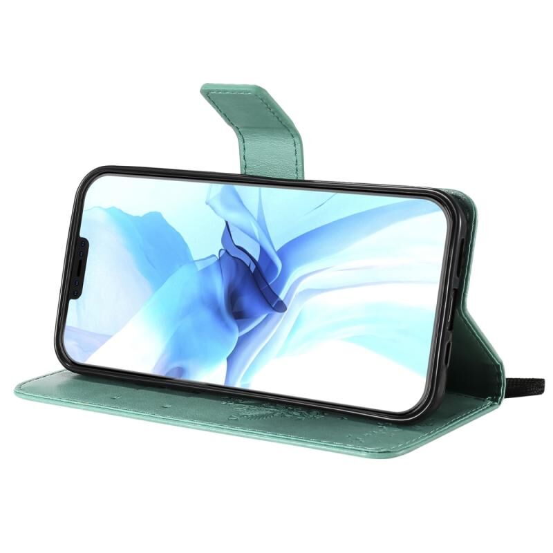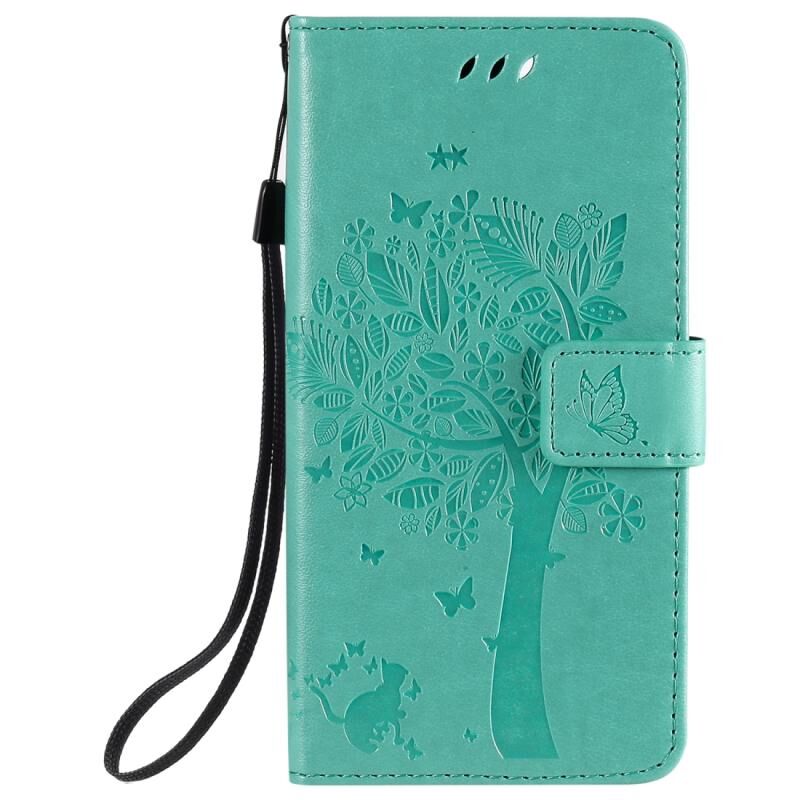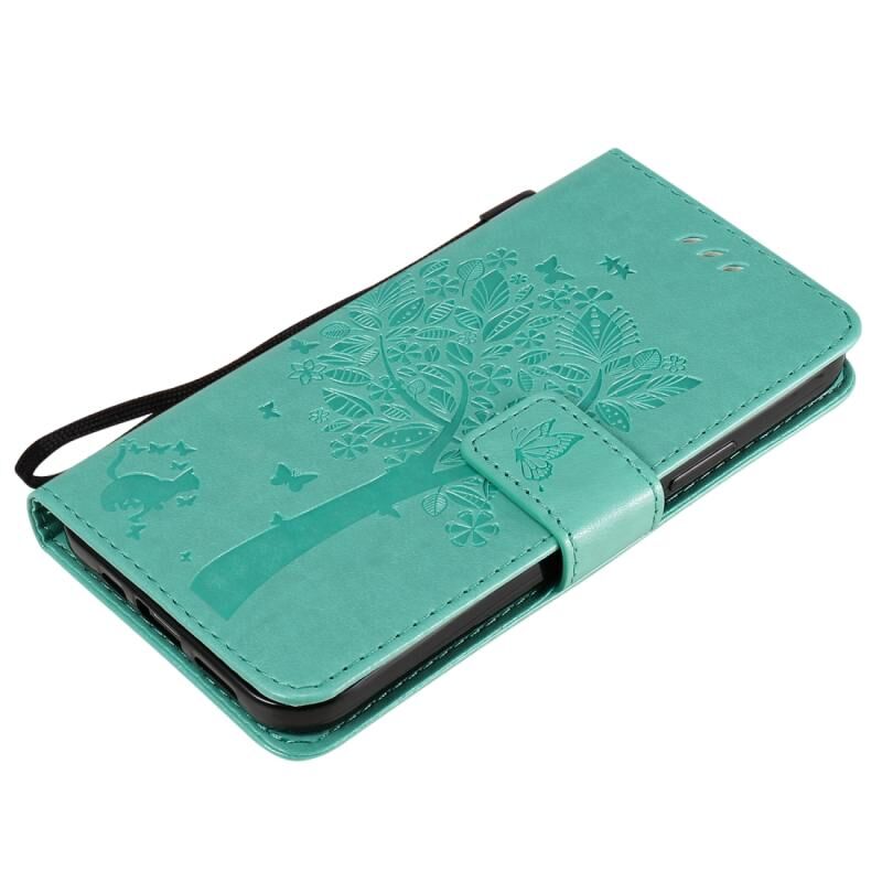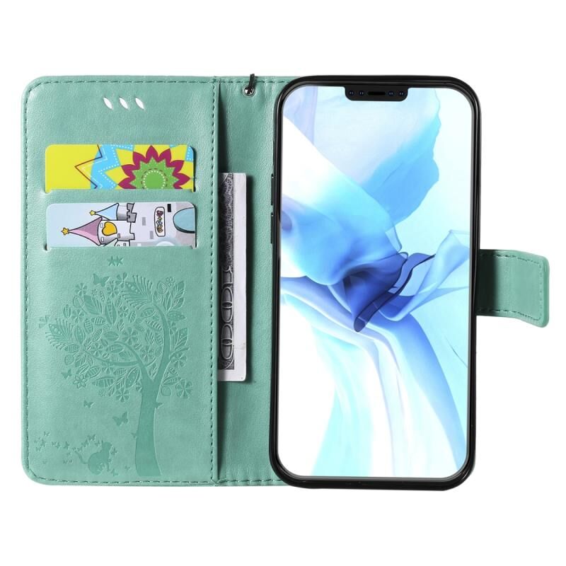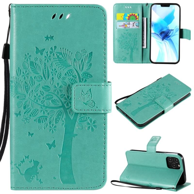 Θήκη δέρματος οριζόντιας αναδίπλωσης για iPhone 12 / 12 Pro με ανάγλυφο σχέδιο δέντρου & γάτας, με βάση & υποδοχές καρτών & πορτοφόλι & κορδόνι (Πράσινο)