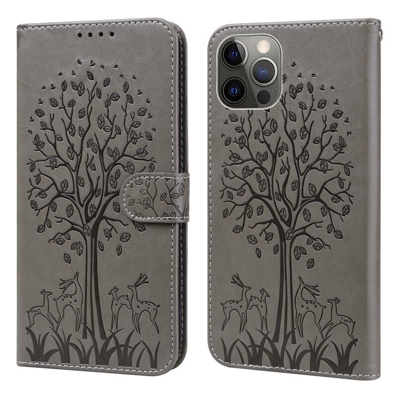 Θήκη τηλεφώνου από δέρμα με οριζόντιο άνοιγμα για iPhone 12 / 12 Pro με σχέδιο δέντρου & ελαφιού, με εκτύπωση (Μωβ)