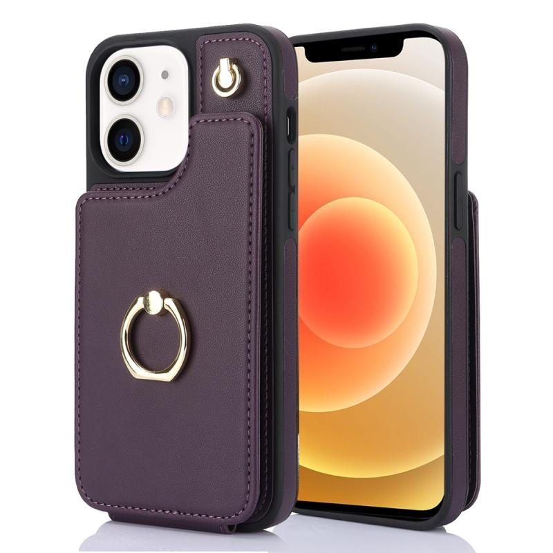 For iPhone 12 / 12 Pro YM005 Skin Feel Card Bag Phone Case with Long Lanyard(Dark Purple)