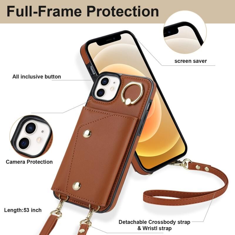 For iPhone 12 / 12 Pro Zipper Card Bag Phone Case with Dual Lanyard(Brown)