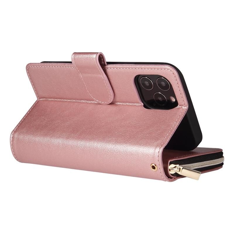 Για iPhone 12 / 12 Pro Θήκη Πορτοφολιού με Φερμουάρ, Οριζόντια, από Δερματίνη PU με Λουρί, 9 Θέσεις για Κάρτες, Πορτοφόλι, Λουρί Κρατήματος & Κορνίζα Φωτογραφίας (Χρυσό Ρόδι)