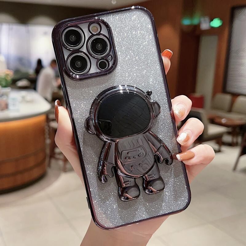 Θήκη τηλεφώνου για iPhone 12 με βάση αστροναύτη, διαβαθμισμένη λάμψη και σκόνη γκλίτερ (Μαύρο)