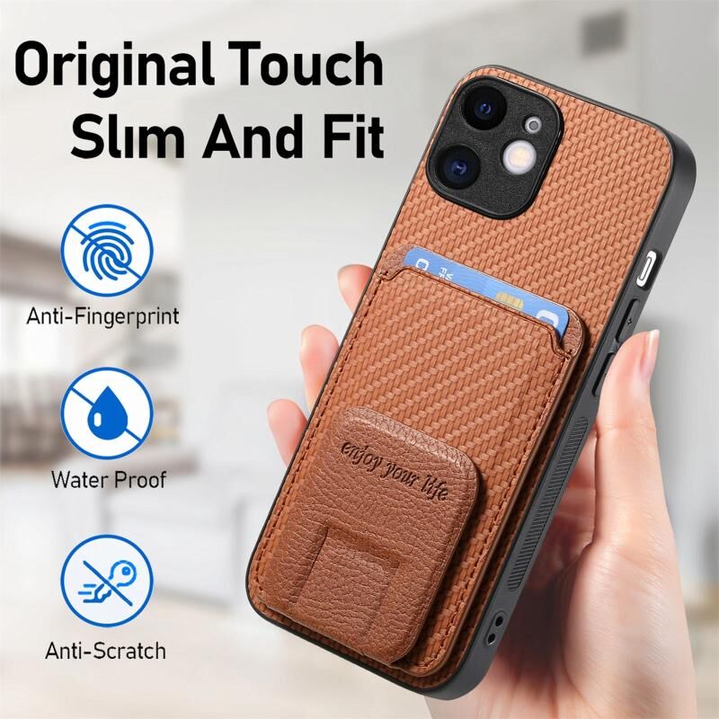 For iPhone 12 Carbon Fiber Card Bag Fold Stand Phone Case(Brown)