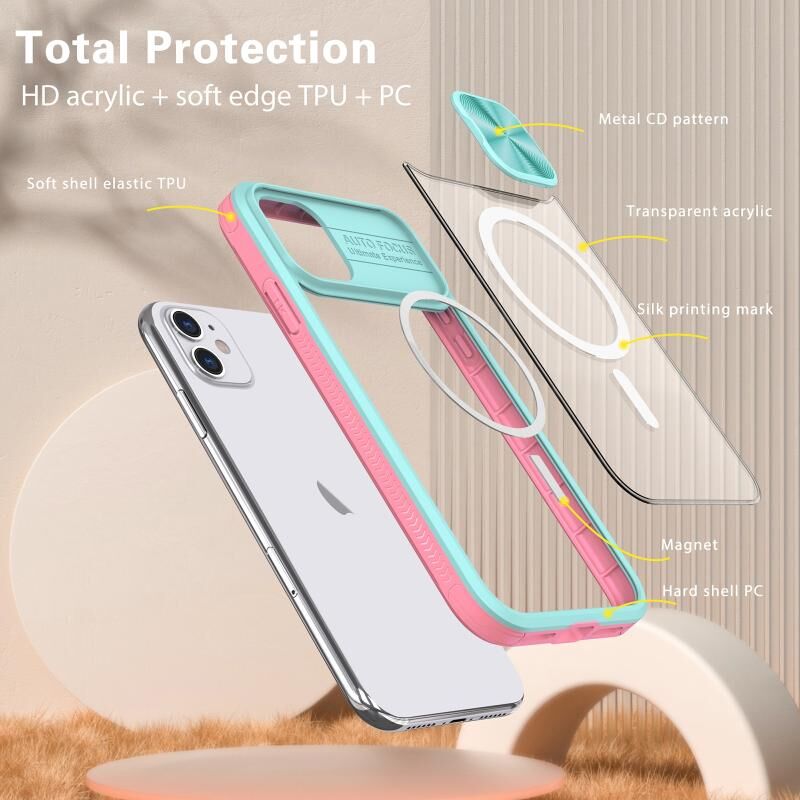 Θήκη κινητού τηλεφώνου πλήρους κάλυψης για iPhone 12 με διαφανές ακρυλικό + PC + TPU, με συρόμενο κάλυμμα φακού MagSafe (Ροζ+Κυανό)