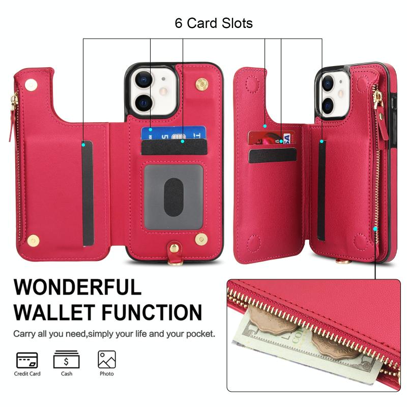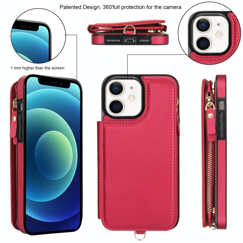 Για iPhone 12 Δερμάτινη Θήκη με Διπλό Φερμουάρ & Σχοινάκι RFID (Κόκκινο)