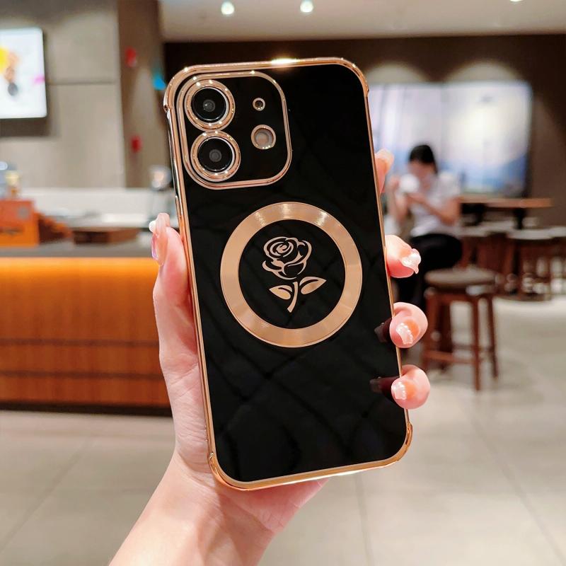 For iPhone 12 Electroplate Side Roses Flower MagSafe Phone Case(Black)