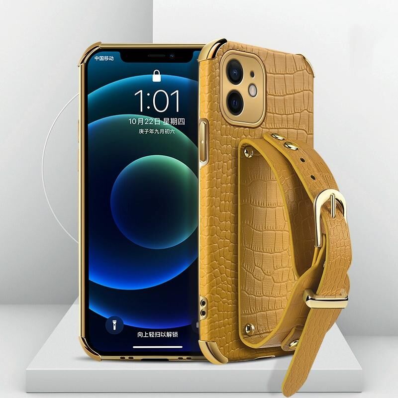 For iPhone 12 Electroplated TPU Crocodile Pattern Leather Case with Wrist Strap(Yellow)