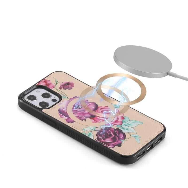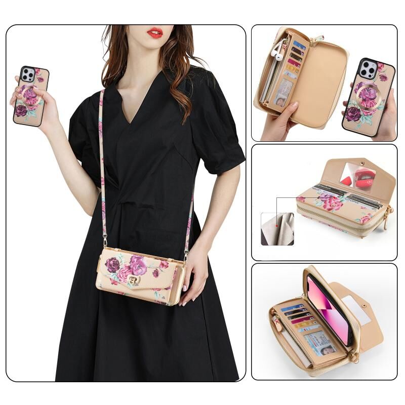 Θήκη τηλεφώνου για iPhone 12, λουλούδια, πολυλειτουργική, crossbody, με φερμουάρ, πορτοφόλι, δερμάτινη, με MagSafe (Ροζ)