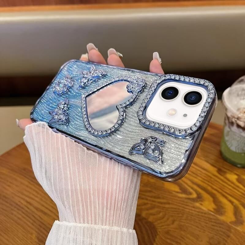 Θήκη τηλεφώνου για iPhone 12 σε σχήμα καρδιάς, με καθρέφτη και λάμψη διαμαντιών (Μπλε)