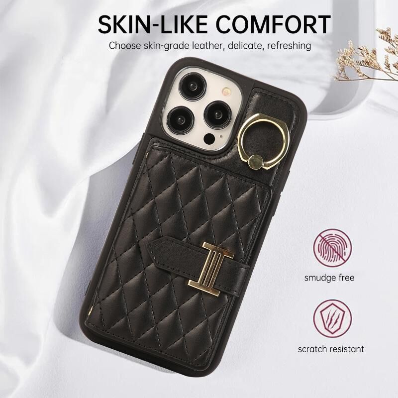 For iPhone 12 Horizontal Card Bag Ring Holder Phone Case with Dual Lanyard(Black)