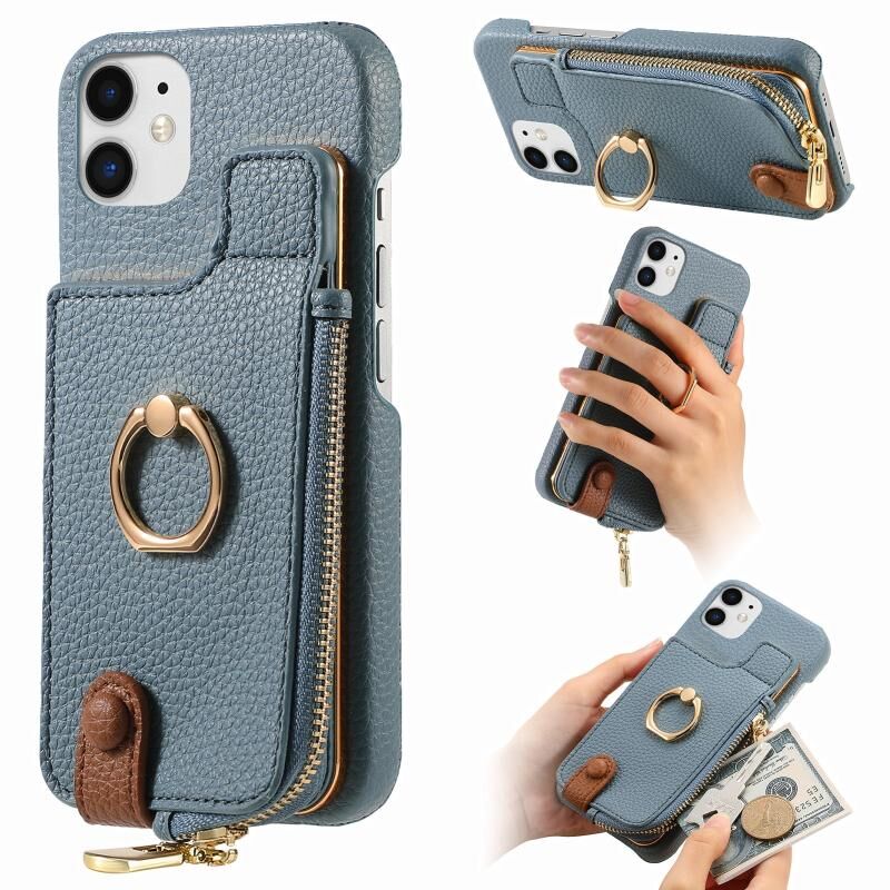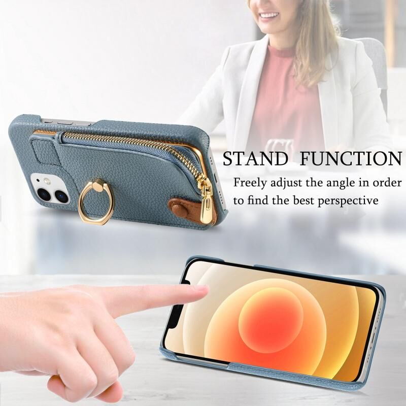 Θήκη κινητού τηλεφώνου για iPhone 12, δερμάτινη Litchi με λεπτές άκρες, δακτύλιος και φερμουάρ (Καφέ)