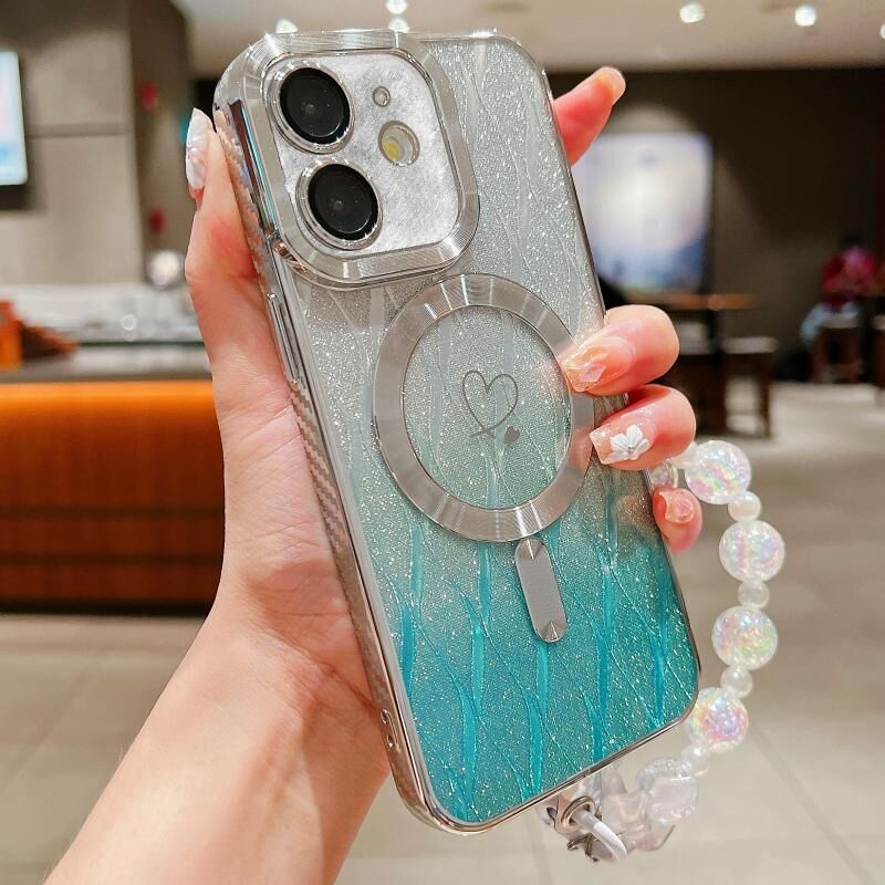For iPhone 12 Loves Leaves Gradient Glitter Bracelets Carbon Fiber Magsafe TPU Phone Case(Green)