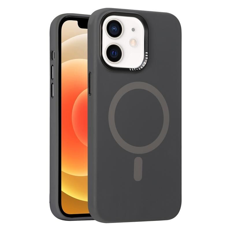 For iPhone 12 Metal Lens Frame Liquid Silicone MagSafe Phone Case(Charcoal Gray)