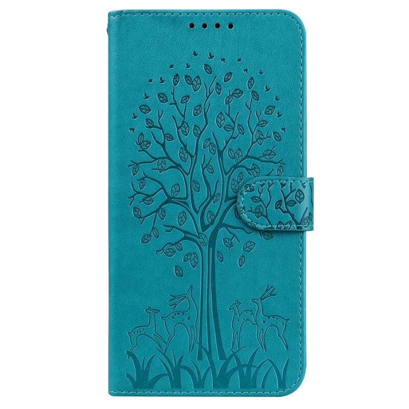 For iPhone 12 mini / 13 mini Tree & Deer Pattern Pressed Printing Horizontal Flip Leather Phone Case(Blue)
