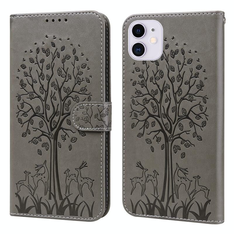 For iPhone 12 mini / 13 mini Tree & Deer Pattern Pressed Printing Horizontal Flip Leather Phone Case (Grey)