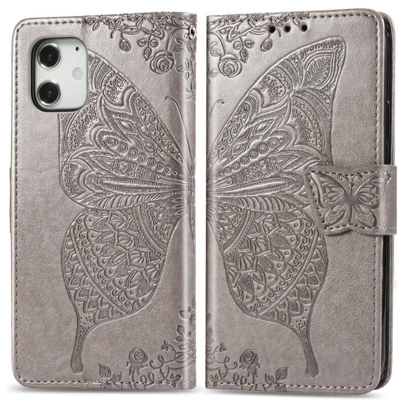 Θήκη δέρματος οριζόντιας αναδίπλωσης για iPhone 12 mini με ανάγλυφο σχέδιο πεταλούδας και λουλουδιών, με βάση / υποδοχή κάρτας / πορτοφόλι / κορδόνι (Γκρι)
