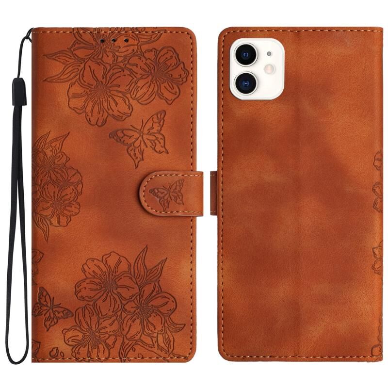 For iPhone 12 mini Cherry Blossom Butterfly Skin Feel Embossed PU Phone Case(Brown)