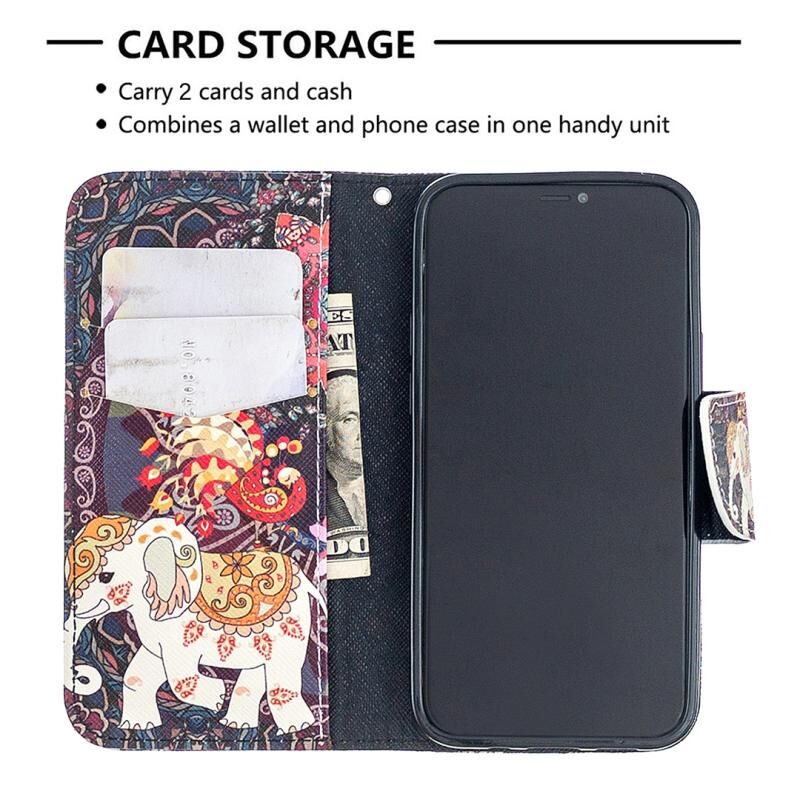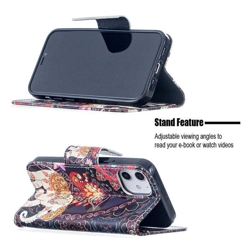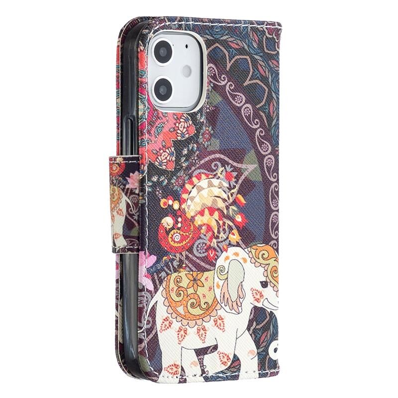 Θήκη δέρματος οριζόντιας αναδίπλωσης με σχέδιο πολύχρωμης ζωγραφικής για iPhone 12 mini με βάση & υποδοχές καρτών & πορτοφόλι (Λουλούδια και Ελέφαντας)