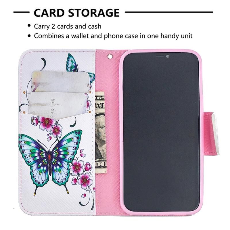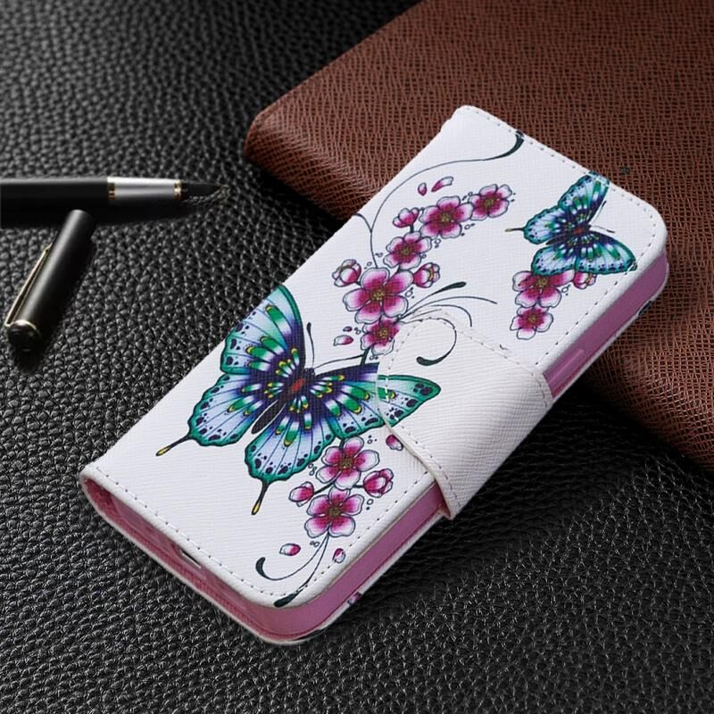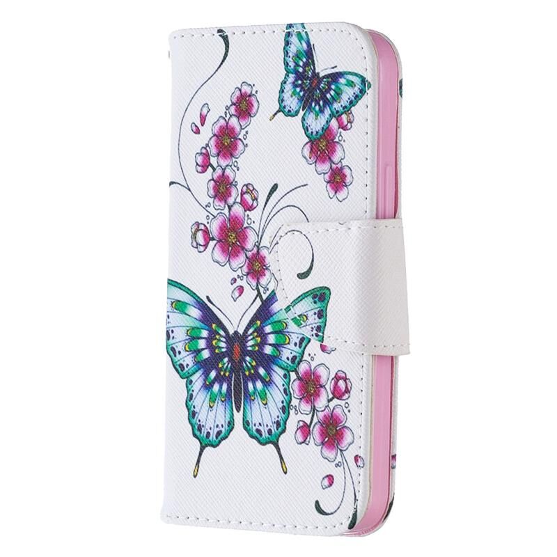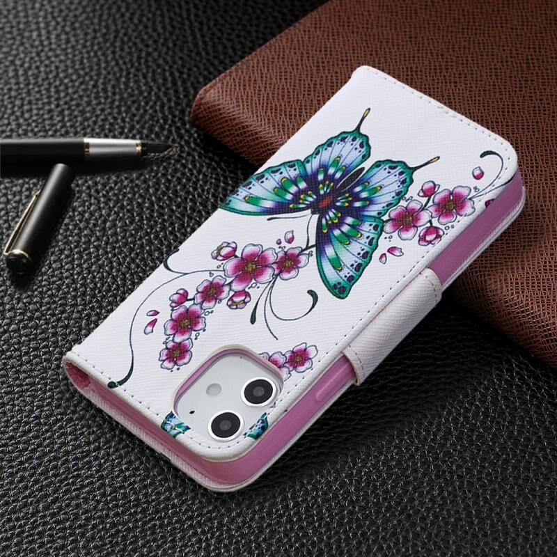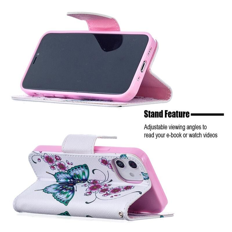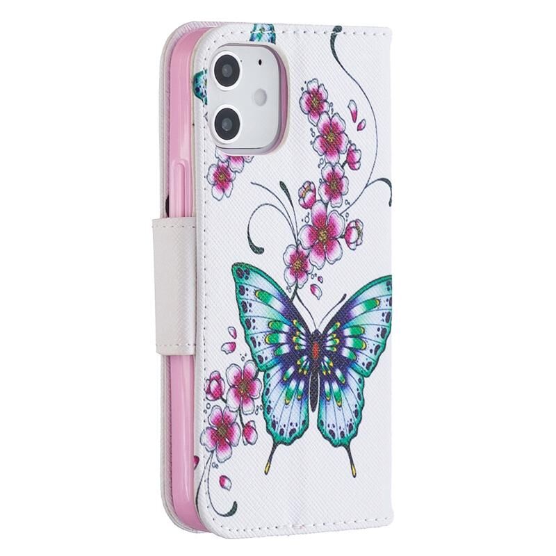 Θήκη δέρματος οριζόντιας αναδίπλωσης για iPhone 12 mini με σχέδιο έγχρωμης ζωγραφικής, βάση στήριξης & υποδοχές καρτών & πορτοφόλι (Ανθισμένη ροδακινιά και πεταλούδα)