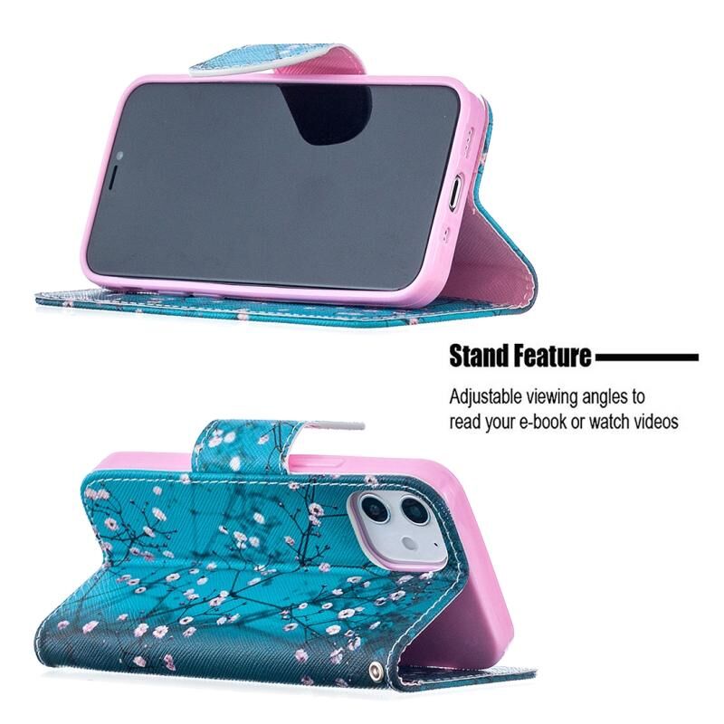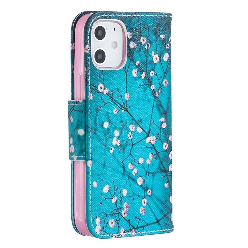 Θήκη δέρματος οριζόντιας αναδίπλωσης με σχέδιο πολύχρωμης ζωγραφικής για iPhone 12 mini με βάση & υποδοχές καρτών & πορτοφόλι (Λουλούδι Δαμασκηνιάς)