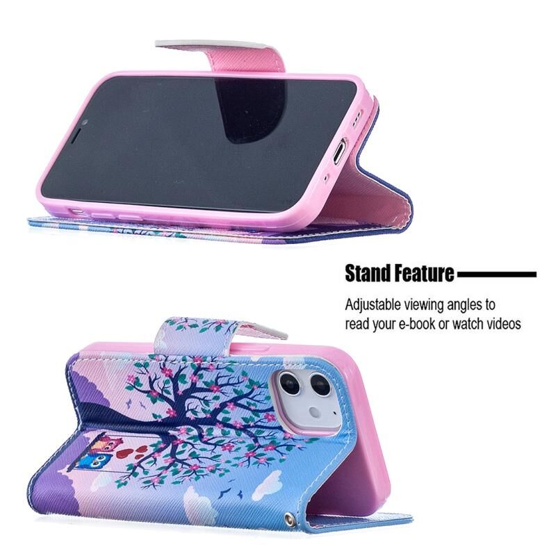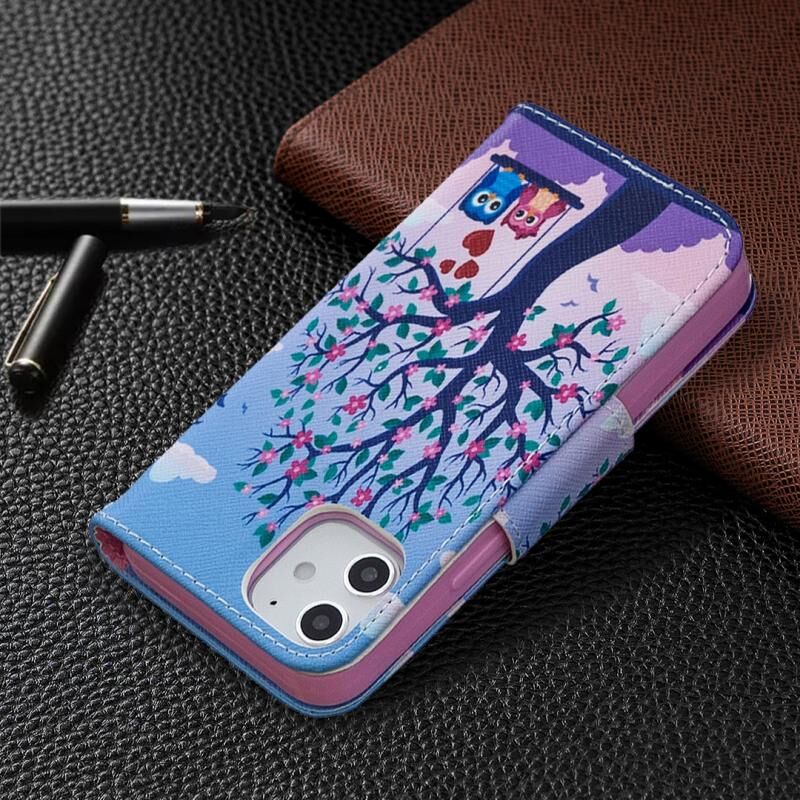 Θήκη δέρματος οριζόντιας αναδίπλωσης με σχέδιο πολύχρωμης ζωγραφικής για iPhone 12 mini με βάση & υποδοχές καρτών & πορτοφόλι (Δύο κουκουβάγιες)