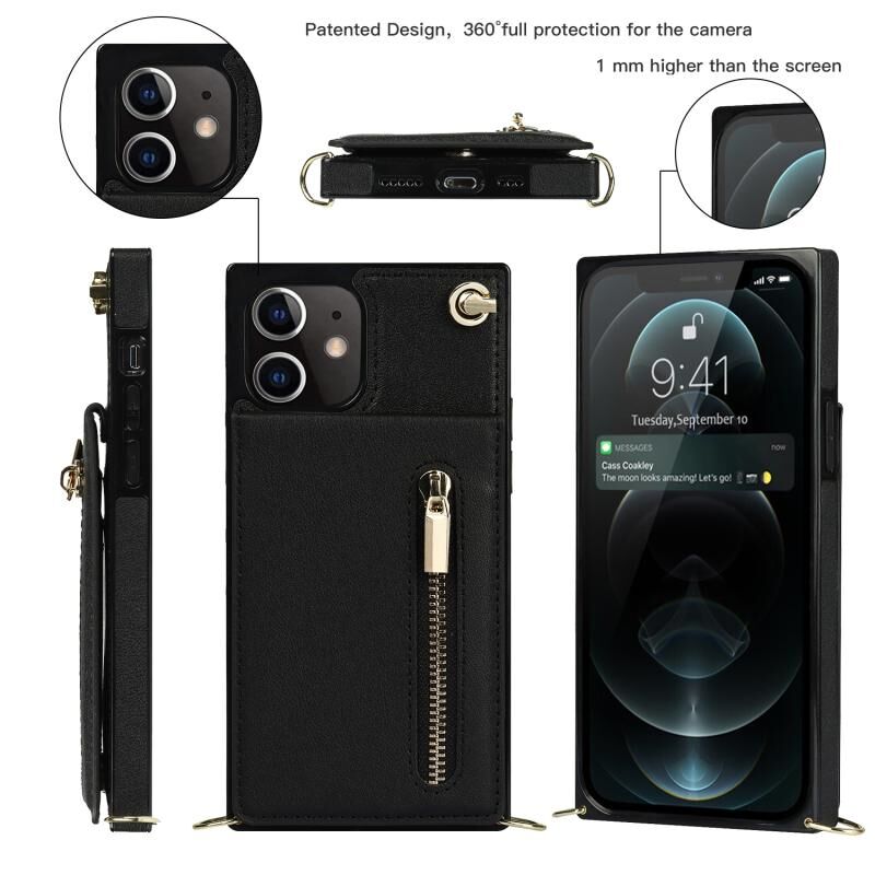 For iPhone 12 mini Cross-body Zipper Square TPU+PU Back Cover Case with Holder & Card Slots & Wallet & Strap (Black)