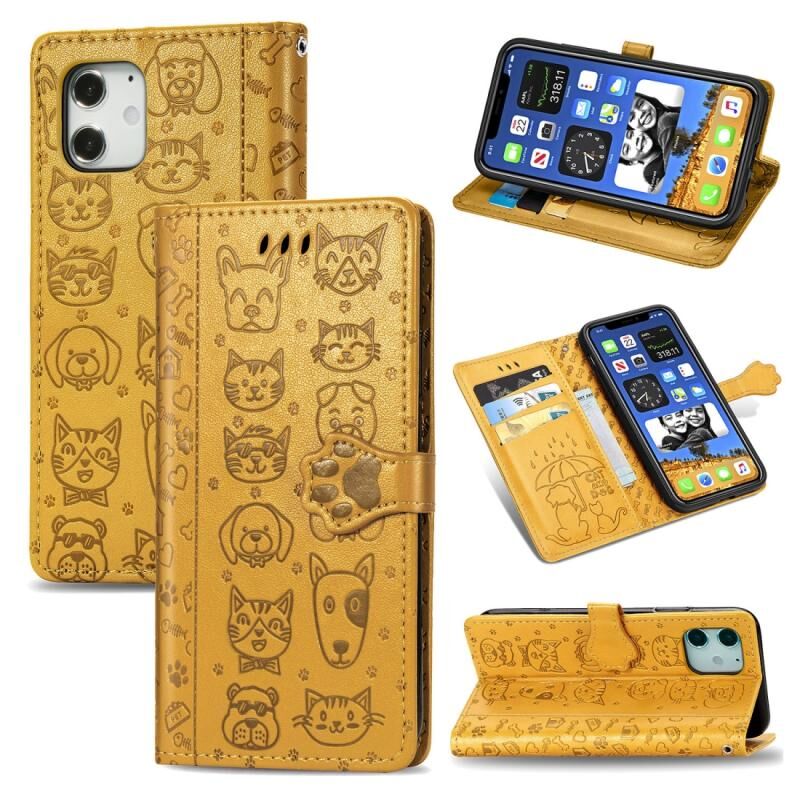 Θήκη δέρματος οριζόντιας αναδίπλωσης για iPhone 12 mini με χαριτωμένα ανάγλυφα σχέδια γάτας και σκύλου, με βάση, θήκες καρτών, πορτοφόλι και λουρί (Ροζ)