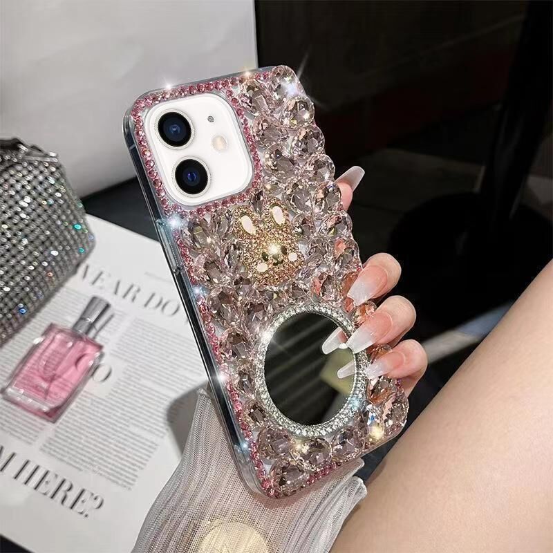 For iPhone 12 mini Diamond Mirror Rabbit Handmade PC Phone Case(Pink Round Mirror)