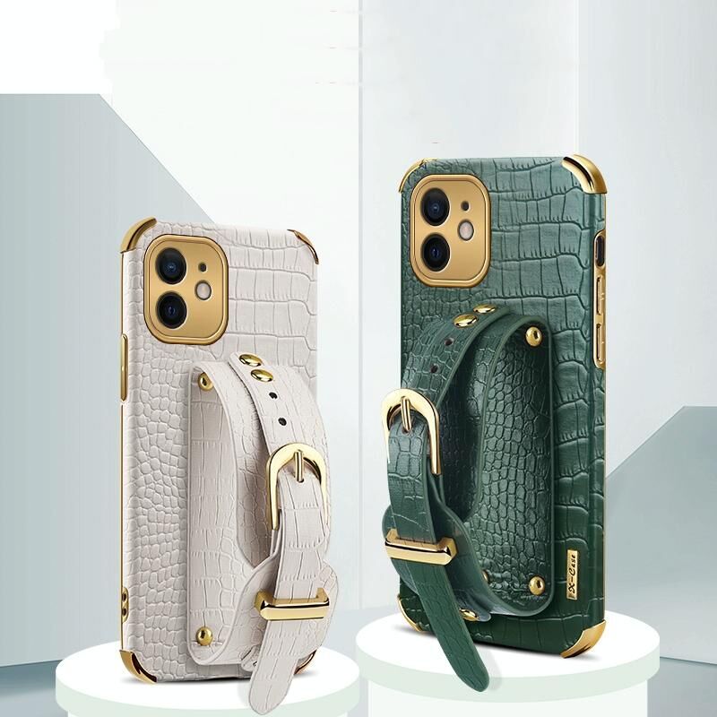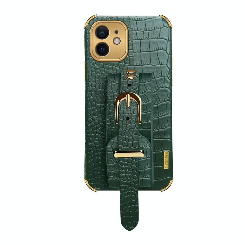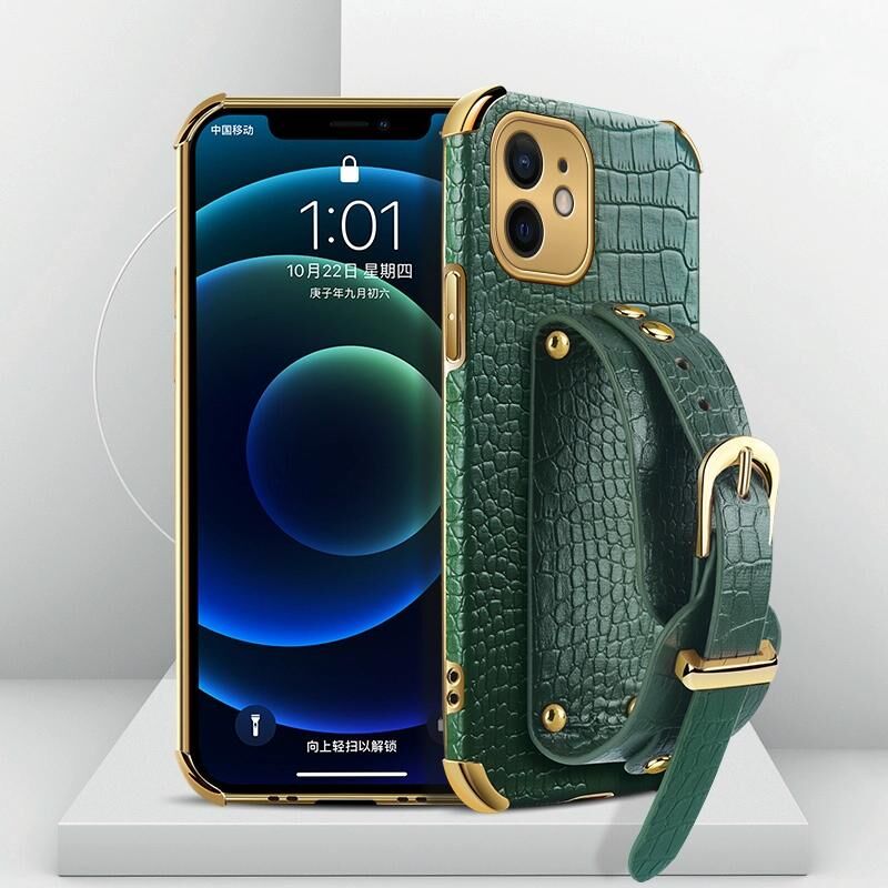 For iPhone 12 mini Electroplated TPU Crocodile Pattern Leather Case with Wrist Strap (Green)