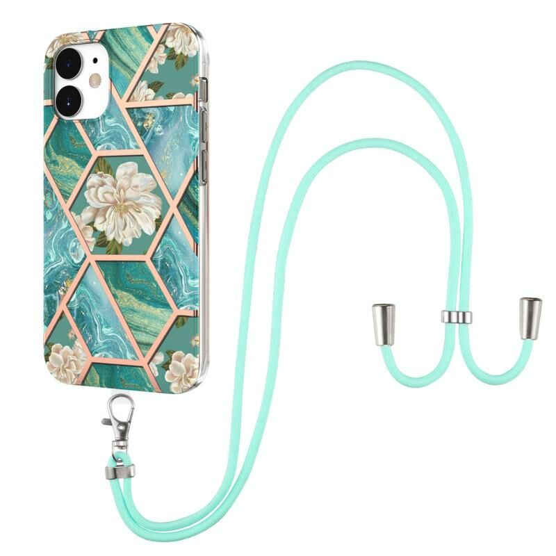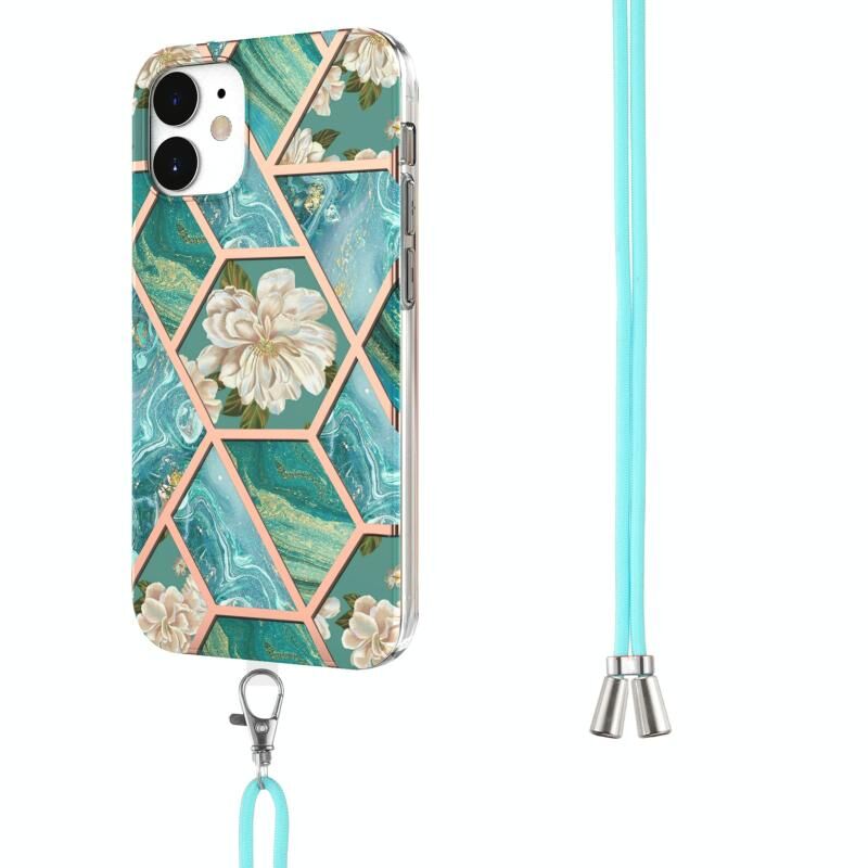 For iPhone 12 mini Electroplating Splicing Marble Flower Pattern TPU Shockproof Case with Lanyard (Blue Flower)