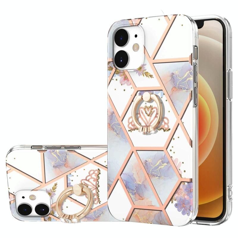 For iPhone 12 mini Electroplating Splicing Marble Flower Pattern TPU Shockproof Case with Rhinestone Ring Holder (Imperial Crown)