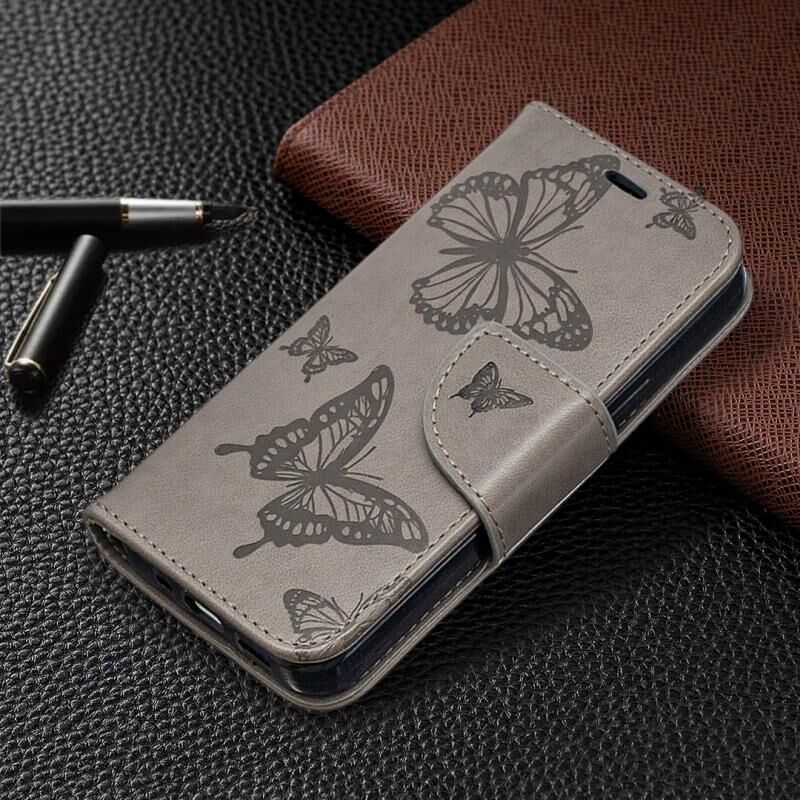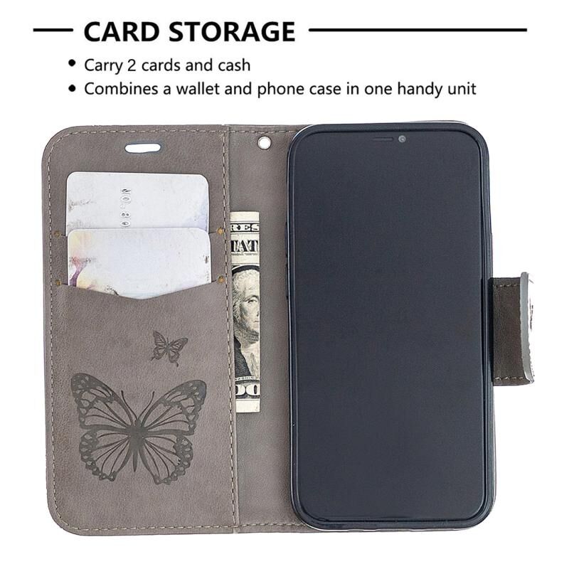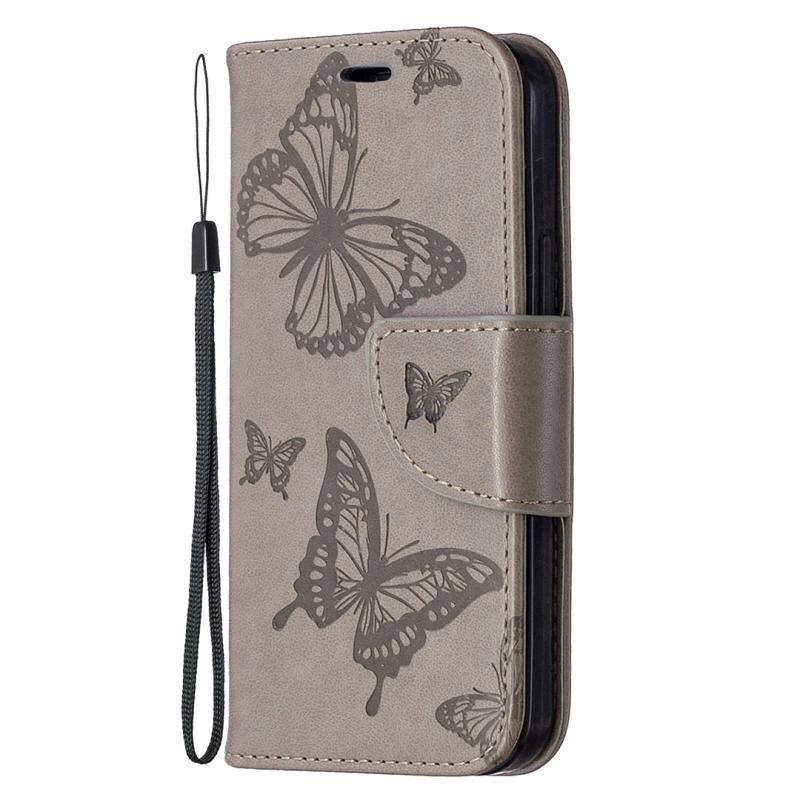 Θήκη για iPhone 12 mini με ανάγλυφο σχέδιο δύο πεταλούδων, οριζόντια, από δερματίνη PU με βάση στήριξης, θήκη για κάρτες, πορτοφόλι & λουρί (Γκρι)