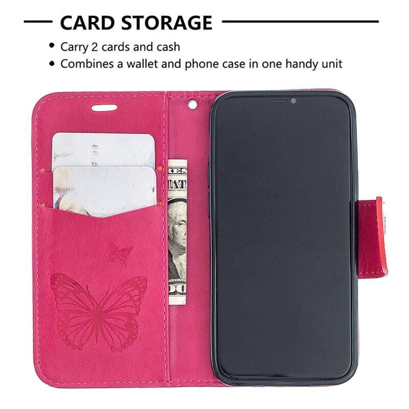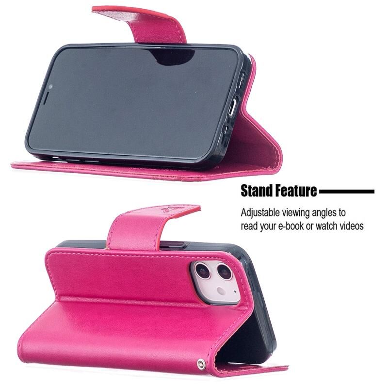 Θήκη για iPhone 12 mini με ανάγλυφο σχέδιο δύο πεταλούδων, οριζόντια, από δερματίνη PU με βάση & υποδοχή κάρτας & πορτοφόλι & κορδόνι (Κόκκινο του Ρόδου)
