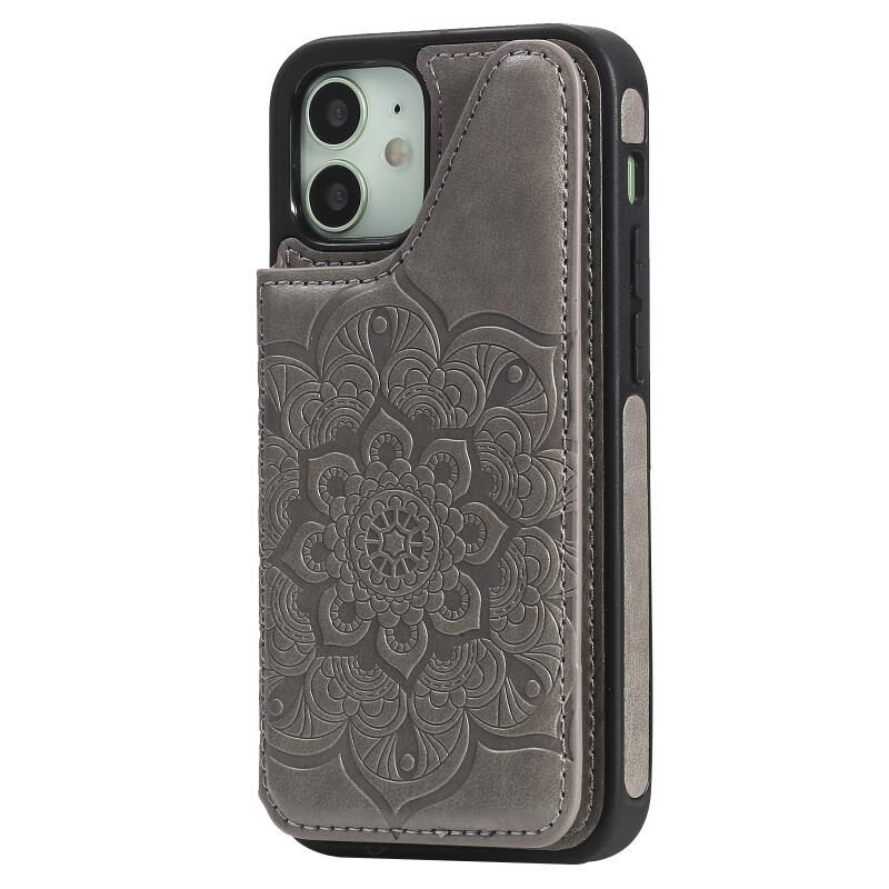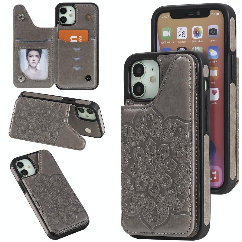 Θήκη προστασίας για iPhone 12 mini με ανάγλυφο σχέδιο λουλουδιών, αντικραδασμική, με βάση στήριξης & θήκες για κάρτες & κορνίζα φωτογραφιών (Γκρι)