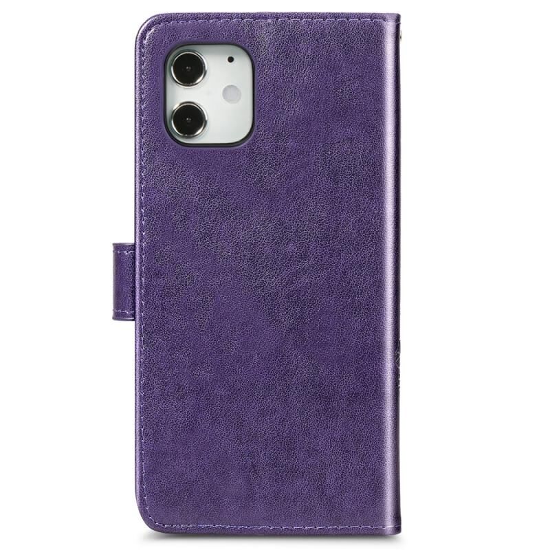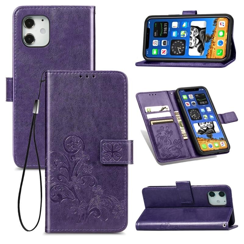 Θήκη δερμάτινη για iPhone 12 mini με σχέδιο τριφυλλιού, ανάγλυφη αγκράφα, προστασία κινητού, λουρί, θήκη για κάρτες, πορτοφόλι και λειτουργία βάσης (Χρυσορόδινο)