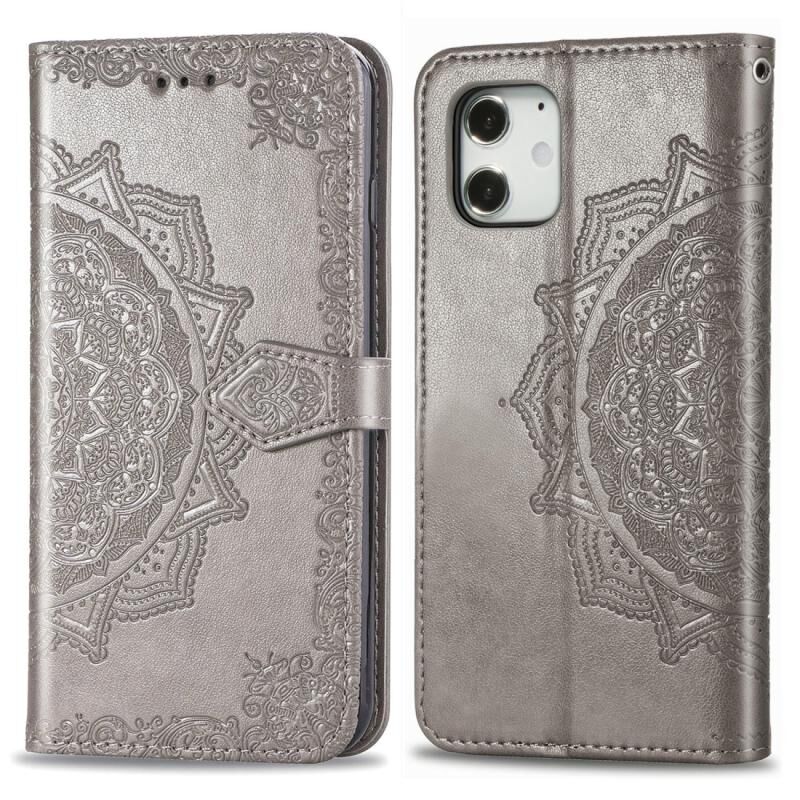 Θήκη δέρματος οριζόντιας αναδίπλωσης για iPhone 12 mini με σχέδιο Mandala σε ανάγλυφο, με βάση, θήκες καρτών, πορτοφόλι και λουρί (Μαύρο)