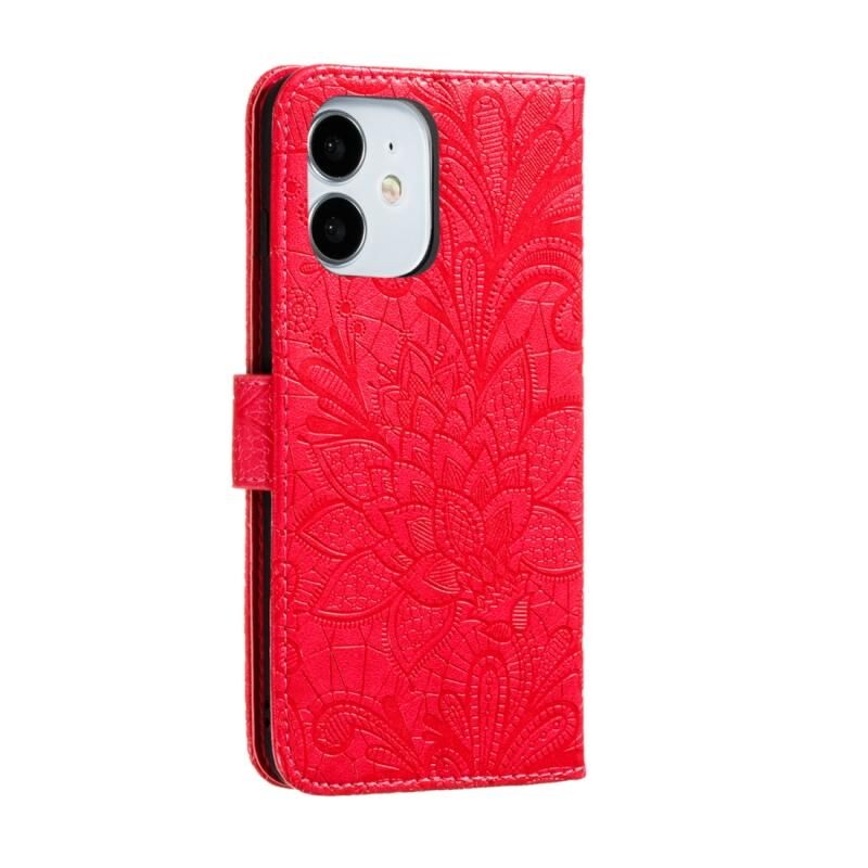 Θήκη για iPhone 12 mini με δαντελένιο λουλούδι, οριζόντια αναδιπλούμενη από δέρμα με βάση, θήκες για κάρτες, πορτοφόλι & κορνίζα φωτογραφιών (Κόκκινο)
