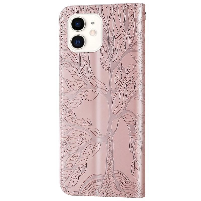 Θήκη δέρματος οριζόντιας αναδίπλωσης για iPhone 12 mini με ανάγλυφο σχέδιο Δέντρου Ζωής, με βάση, θήκη καρτών, πορτοφόλι, κορνίζα φωτογραφιών & λουρί (Χρυσό Ροζ)