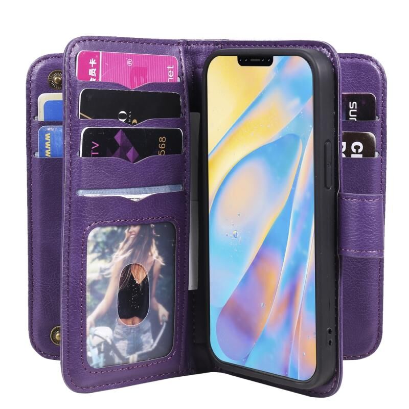 Θήκη για iPhone 12 mini, πολυλειτουργική μαγνητική με αγκράφα από χαλκό, οριζόντια, μονόχρωμη, από δέρμα με 10 υποδοχές για κάρτες, πορτοφόλι, βάση & κορνίζα φωτογραφιών (Κρασί)