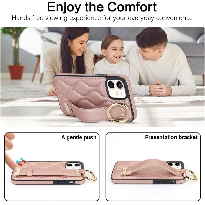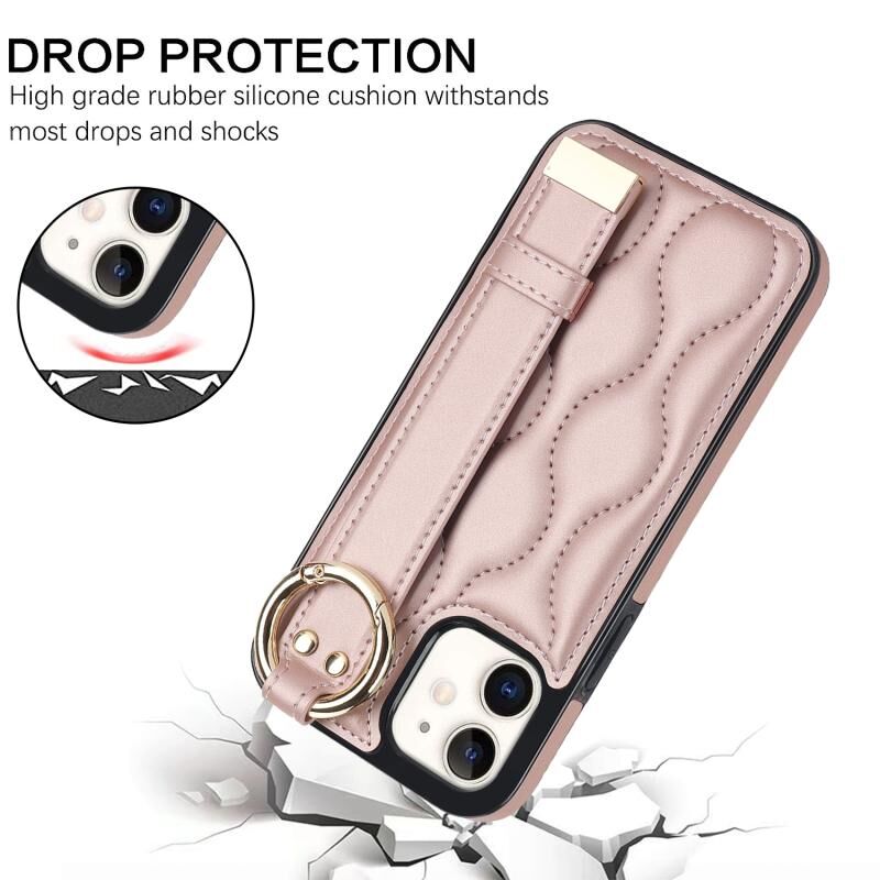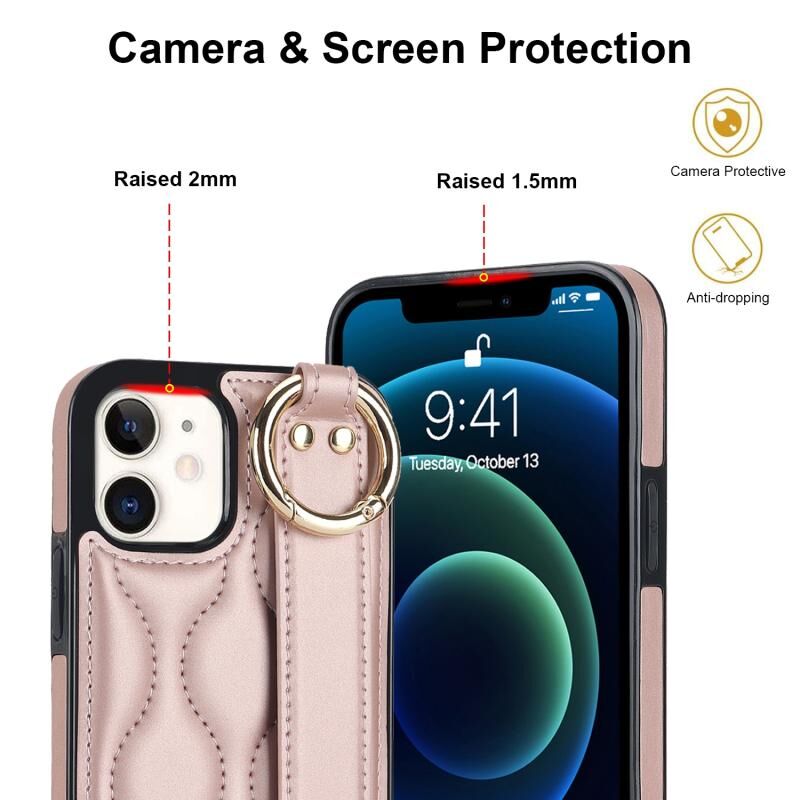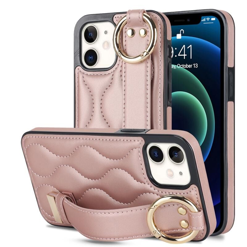 For iPhone 12 mini Non-slip Full Coverage Ring PU Phone Case with Wristband(Rose Gold)