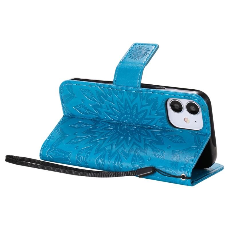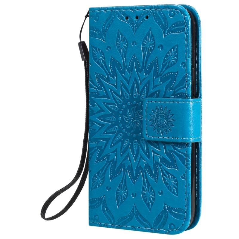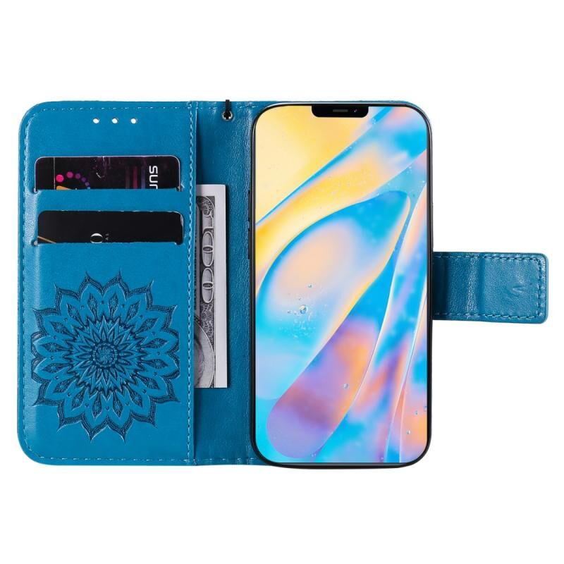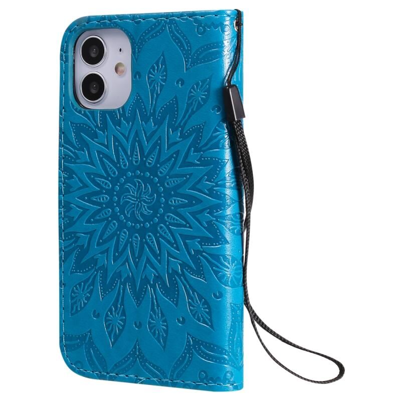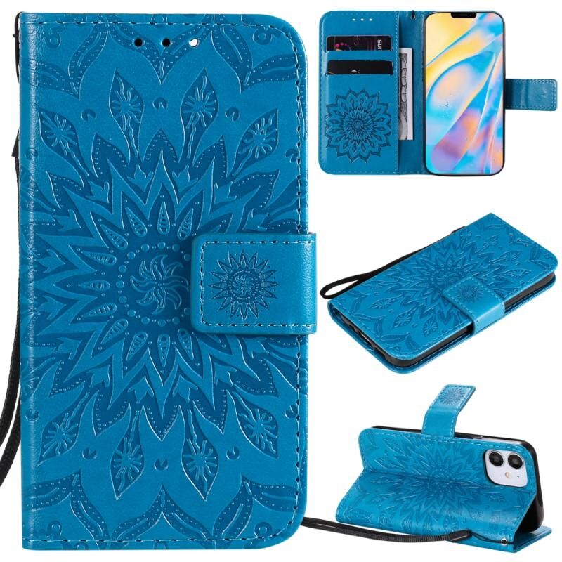 Θήκη για iPhone 12 mini με εκτύπωση Pressed, σχέδιο ηλιοτρόπιο, οριζόντια θήκη από δερματίνη PU με βάση & υποδοχές καρτών & πορτοφόλι & κορδόνι (Μπλε)